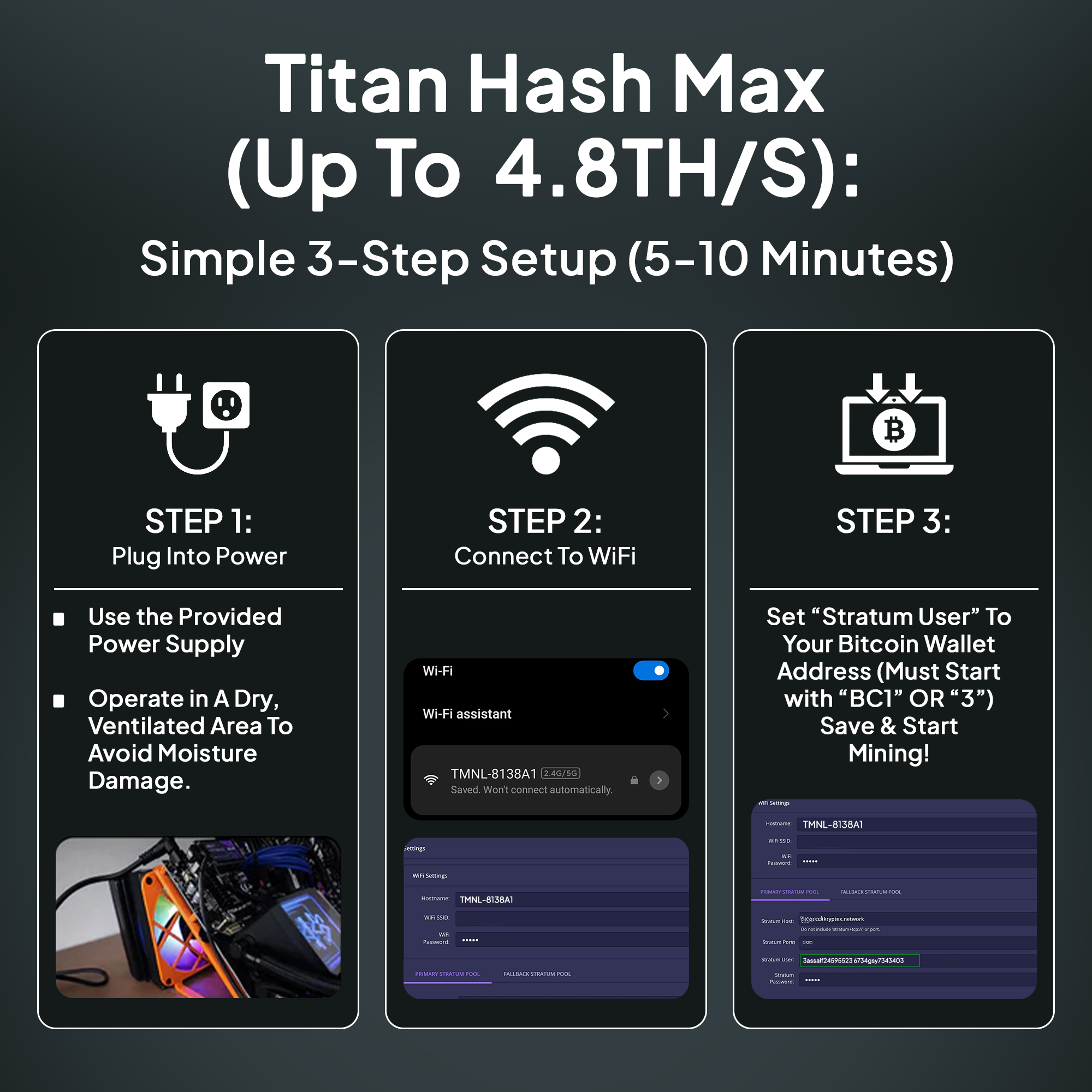 The Titan Max connects to the Bitcoin network and performs real solo mining - meaning it independently tries to find a valid block hash. It uses open, read-only network data to participate safely in the mining process without accessing your personal information or wallet.